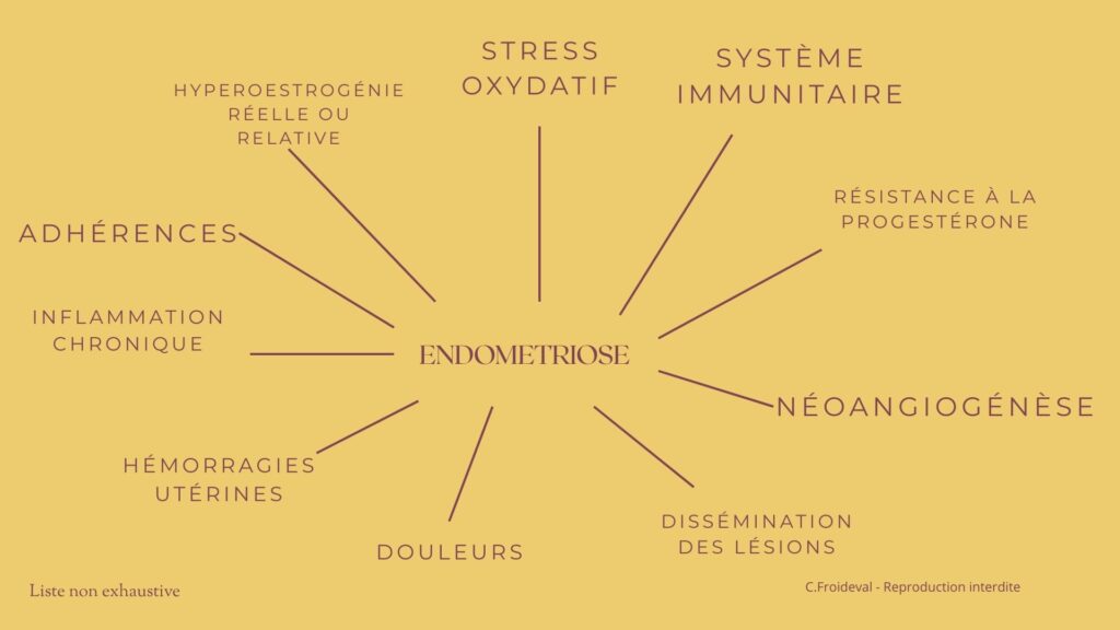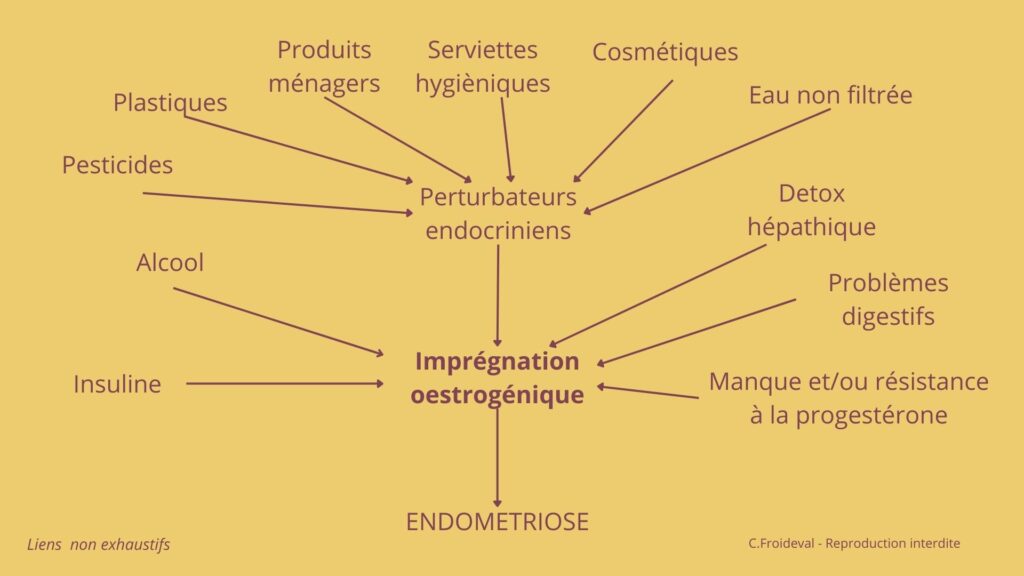 Dans le schéma précédent, nous avons vu que l’un des facteurs de l’endométriose est l’hyperoestrogénie réelle ou relative, on parlera plutôt d’imprégnation oestrogénique. Ce deuxième schéma nous apporte des pistes de réflexion pour comprendre l’origine de cette imprégnation oestrogénique et ainsi agir sur ses causes. Chaque cause est multifactorielle et dépendante de chaque femme. Mais nous voyons déjà que beaucoup de systèmes sont impliqués, ce qui rend indispensable le travail sur l’ensemble ! La vision holistique de terrain prend tout son sens dans l’accompagnement de l’endométriose.