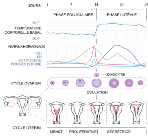 Rappelons que le cycle féminin est divisé en deux phases : la phase folliculaire et la phase lutéale. Pendant la phase folliculaire, un follicule en particulier va grossir et prendre le dessus sur les autres (c’est le follicule de De Graaf) grâce à l‘hormone FSH (Follicle Stimulating Hormone), c’est une hormone sécrétée par l’hypophyse qui va comme son nom l’indique stimulée le follicule. Pendant cette phase, les oestrogènes augmentent de plus en plus, ce qui va permettre le développement de la muqueuse utérine. La progestérone n’est pas sécrétée dans cette première partie du cycle. Quand le niveau d’oestrogène est assez haut, l’hypophyse de sécréter la LH (Luteinizing Hormone) qui va lutéiniser le follicule et provoquer l’ovulation. La femme rentre alors dans la seconde phase de son cycle, la phase lutéale (du latin « luteum » qui veut dire jaune). Le follicule vidé de l’ovocyte se transforme en corps jaune et va sécréter la progestérone et des oestrogènes.